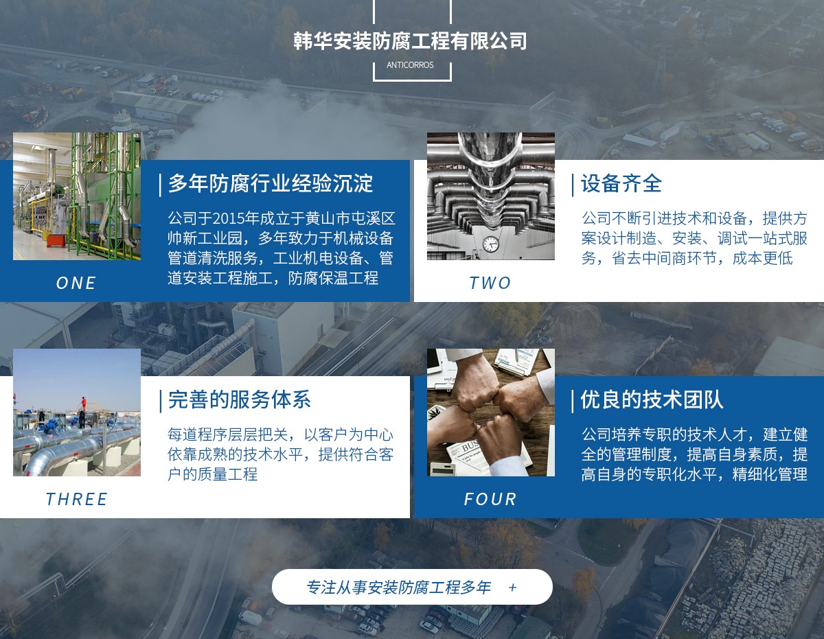 黃山市韓華建設(shè)工程有限公司坐落于美麗的黃山市屯溪區(qū)老街街道新安北路夢(mèng)園村,公司主營(yíng)機(jī)械設(shè)備管道清洗服務(wù),工業(yè)機(jī)電設(shè)備、管道安裝工程施工,防腐保溫工程;防水防火工程等...